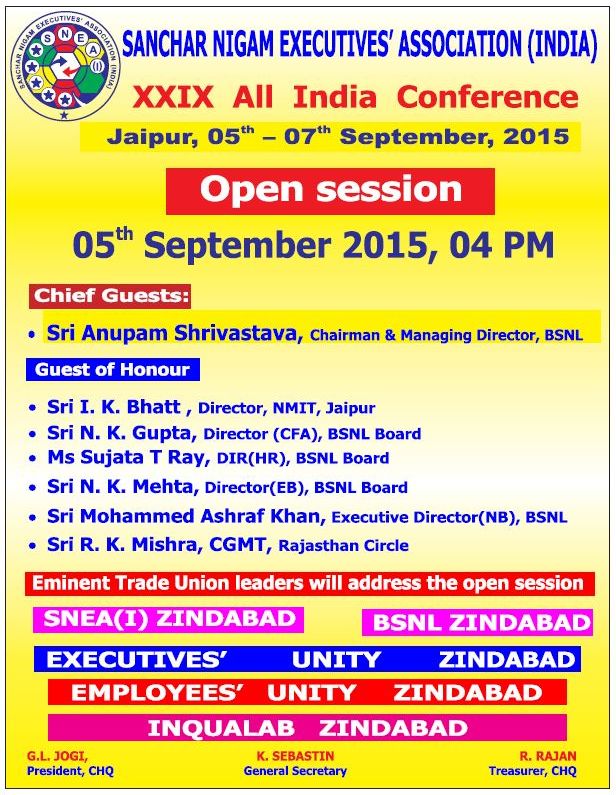 XXIX All India Conference of Sanchar Nigam Executives Association (India) will be held in accordance to the provisions of the constitution of the association at Utsav Shri Maheshwari Samaj Janaupayogi Bhawan, Sector -2, Vidhyadhar Nagar, Jaipur, Rajasthan on 05th, 06th and 07 -09-2015.The pre- A.I.C. CWC meeting will be held at the same venue on 04.09.2015.